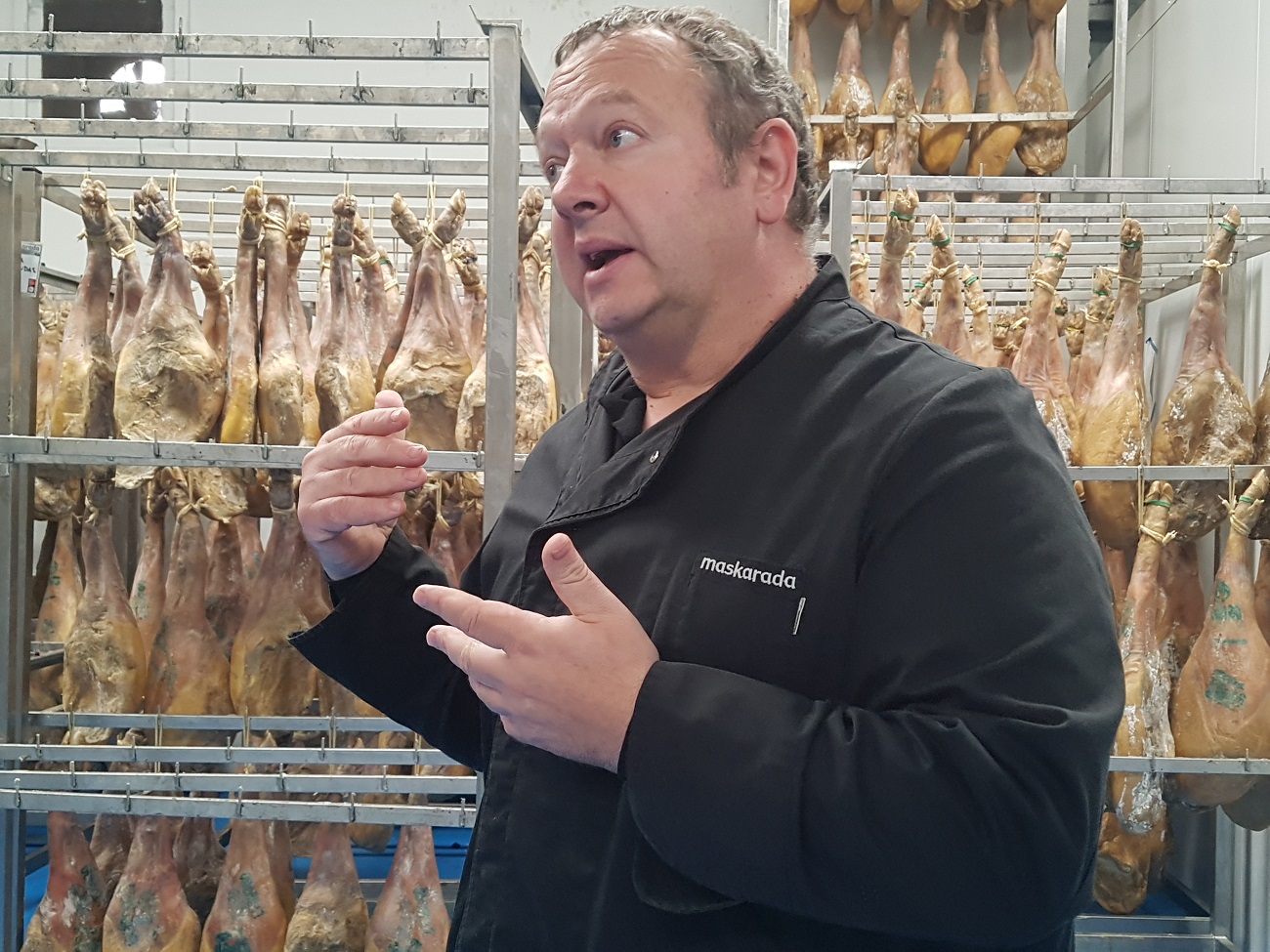 Basque pigs with black and white patches raised ethically on acorns and herbs.— with heart, mind, and palate open.